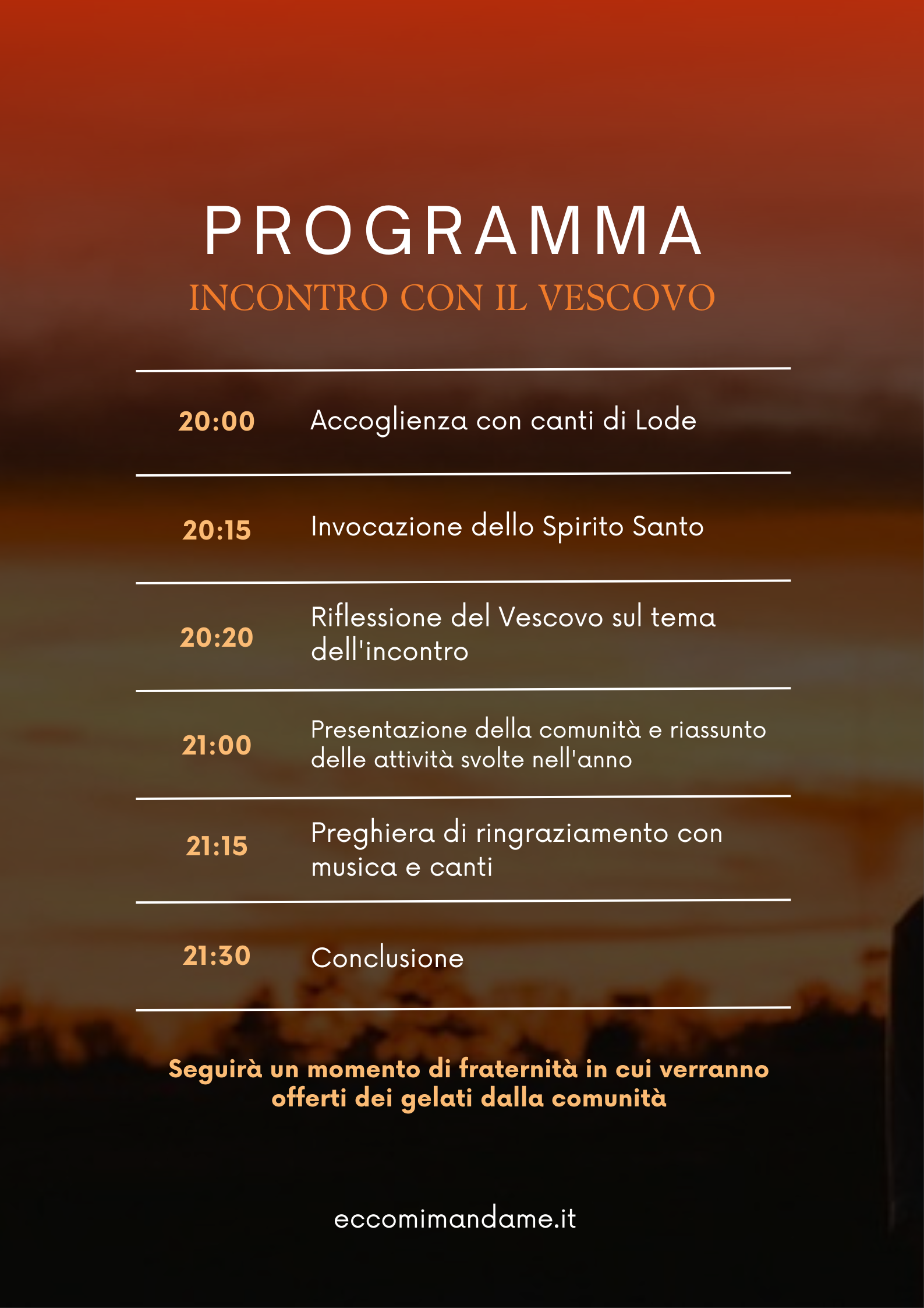 Essendo anche la vigilia di Pentecoste, chiederemo, davanti a Gesù Eucarestia, una nuova unzione dello Spirito Santo che ci renda forti e audaci nell'evangelizzazione. Vi esortiamo quindi ad essere presenti e a portare con voi il vostro coleader o un membro della vostra cellula che pensate possa crescere in questo ministero.