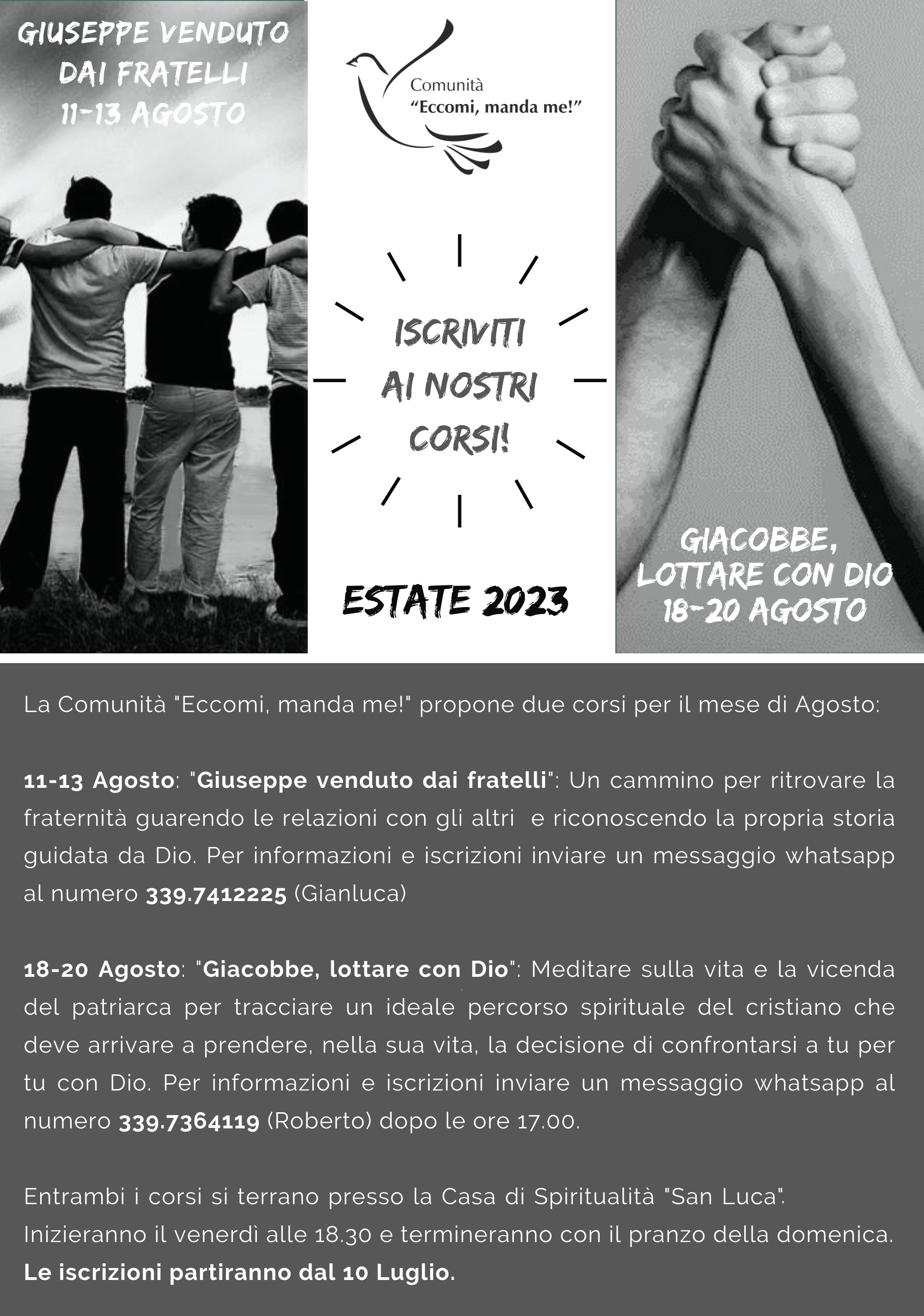 11-13 Agosto: "Giuseppe venduto dai fratelli": un cammino per ritrovare la fraternità guarendo le relazioni con gli altri e riconoscendo la propria storia guidata da Dio. Per informazioni e iscrizioni inviare un messaggio whatsapp al numero 339.7412225 (Gianluca)