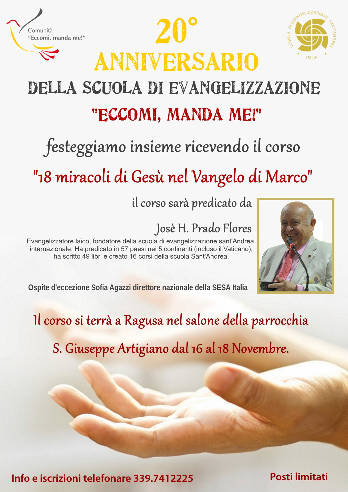 In occasione del 20° anniversario della Scuola di Evangelizzazione "Eccomi, manda me!" vi invitiamo a partecipare dal 16 al 18 Novembre 2018 al corso "18 miracoli di Gesù nel Vangelo di Marco". Il corso sarà predicato da Josè H. Prado Flores, fondatore della Scuola Sant'Andrea. Sarà presente anche Sofia Agazzi, direttore nazionale della SESA Italia.